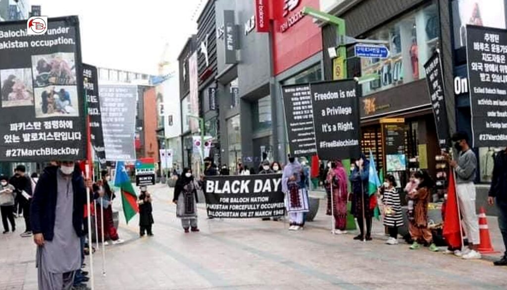 زھرشانی بوسان ءِ شھر ءَ بیتگ کہ اود ءَ زھرشانی کنوکاں بیست ءُ ھپت مارچ ءِ درگت ءَ بینرز دستاں بیتگ اَنت ءُ آیانی سر ءَ بلوچستان ءِ سر ءَ پاکستان ءِ زورگری ءِ بارہ ءَ نبشتگ بیتگ اَنت ءُ زھرشانی کنوکاں اوگام جتگ ءَ آجوئی ءِ لوٹ کرتگ –