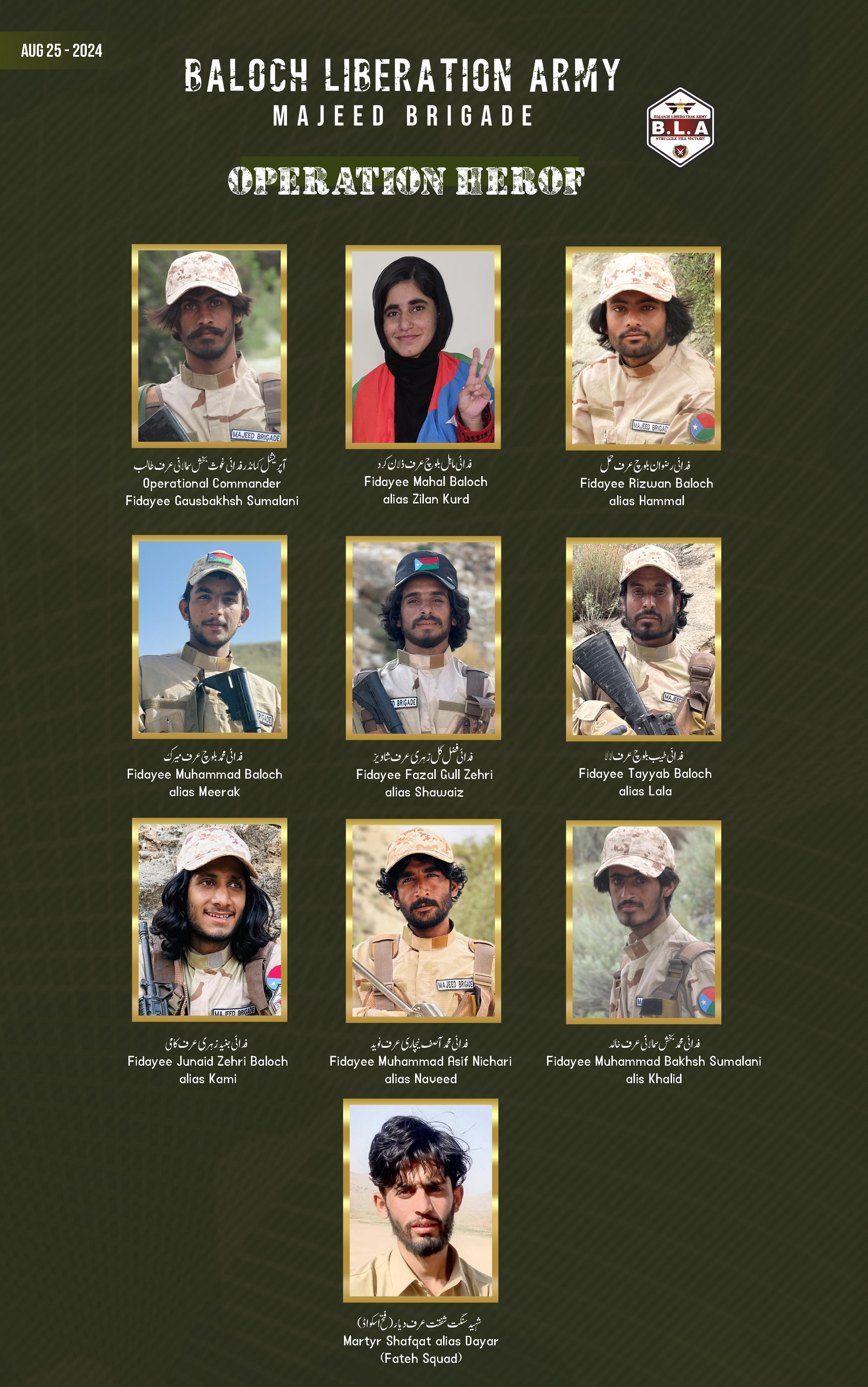 بلوچ لبریشن آرمی ءِ جارکش جیئند بلوچ ءَ رسانکدر ءَ وتی سرجمیں بیان ءَ گْوشتگ کہ ”آپریشن ھِیرّوپ“ بیست کلاک ءَ پد جوانیں رنگے ءَ آسر بوتگ۔ اے آپریشن ءِ سرجمی ءَ آرگ ءِ وھد ءَ بی ایل اے مجید برگیڈ ءِ 9 جِند ندریں ءُ فتح اسکواڈ ءِ یک ھُنرمندیں سرمچارے ھوار شھید بوتگ اَنت، وھدے کہ آپریشن ءِ وھد ءَ دژمن ءِ 130 کارندہ کشتگ انت-