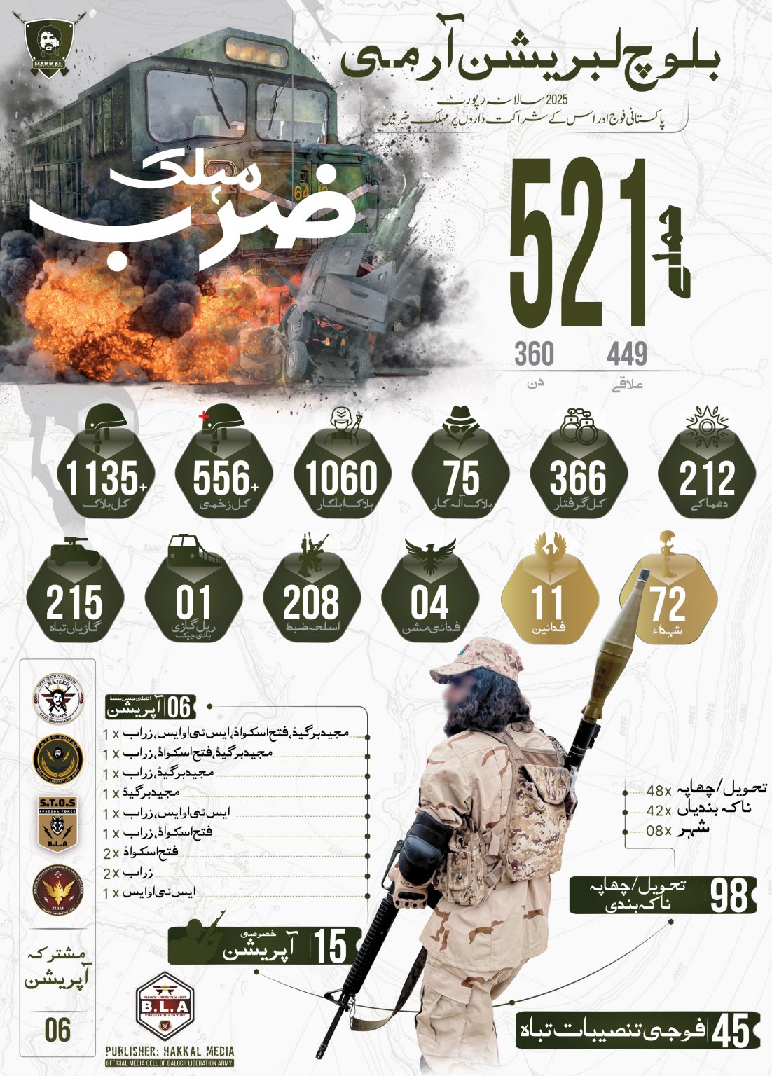بلوچ لبریشن آرمی ءَ سالگشری کاروائیانی اھوال ‘ دک’ شنگ، اھوالاں سال 2025 ءَ کاروائیانی انفوگرافکس، اکس ءُ سرجمیں اھوال درشان کتگ انت-
